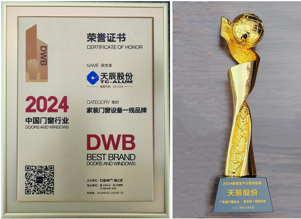 ??在會議的頒獎(jiǎng)典禮上,天辰股份榮獲會議晚宴總冠名、“家裝門窗設(shè)備一線品牌”以及“新質(zhì)生產(chǎn)力領(lǐng)軍品牌”的榮譽(yù)。