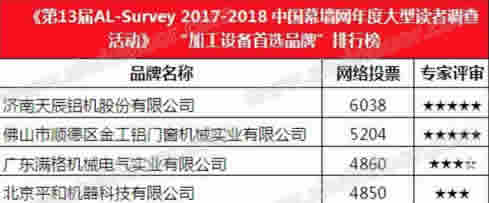 “天辰股份”憑借其雄厚的技術(shù)實力和品牌影響力,最終贏得廣大終端客戶、行業(yè)專家、設(shè)計院、顧問公司和媒體總編的高度認可,在第13屆AL-Survey2017-2018中國門窗幕墻行業(yè)大型讀者調(diào)查暨“我最喜愛品牌”評選活動中,成功衛(wèi)冕“加工設(shè)備首選品牌”大獎!