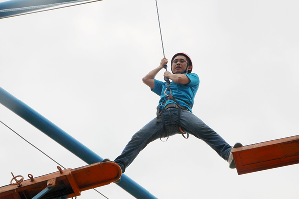 此次拓展訓練加大了難度,增加了高空斷橋項目。挑戰(zhàn)人員需自行爬上八米的立柱,從很窄的木板上走過,然后跨越到一米半以外的另一塊木板上,然后從兩塊木板中間跳下。雖然有保險繩保護,但對于參與者的心理和體力還是一個很大的挑戰(zhàn)。