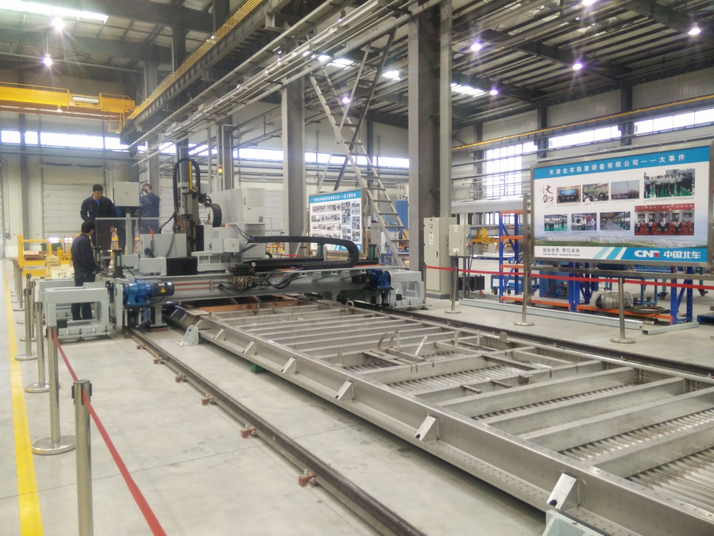 超長數(shù)控四軸龍門加工中心有效加工長度近30米,可實現(xiàn)四軸聯(lián)動加工,并配置12刀位旋轉(zhuǎn)刀庫、大功率HSD高速電主軸及雙端鋸切裝置,主要適用于高鐵等軌道交通車體鋁型材的高速鉆銑、鋸切加工;數(shù)控鉆銑中心采用框架式龍門結(jié)構(gòu),機床剛性好,可完成復雜三軸聯(lián)動加工,適合碳鋼、高強度不銹鋼等車體的高效粗、精加工,主要用于軌道交通車輛底架與轉(zhuǎn)向架連接處的平面、定位孔等工序的加工,具備銑削、鉆削、鏜孔及攻螺紋等功能。